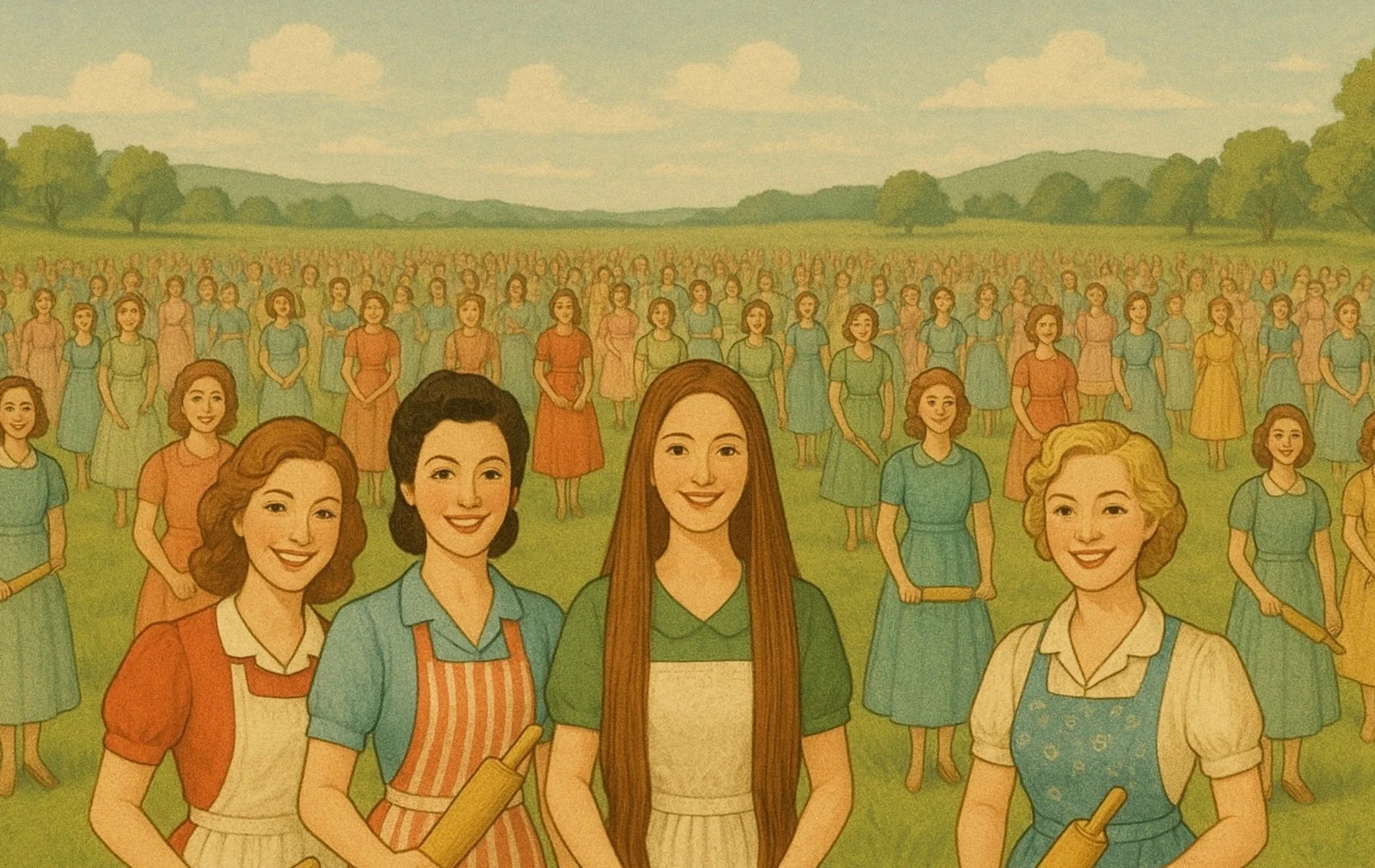 Hundrevis av kvinner i pastellkjoler står på en eng, mange med kjevler i hendene, alle smilende, alle like. I forgrunnen: fire kvinner som ser rett mot deg. Stemningen er lys, trygg og nostalgisk – eller?